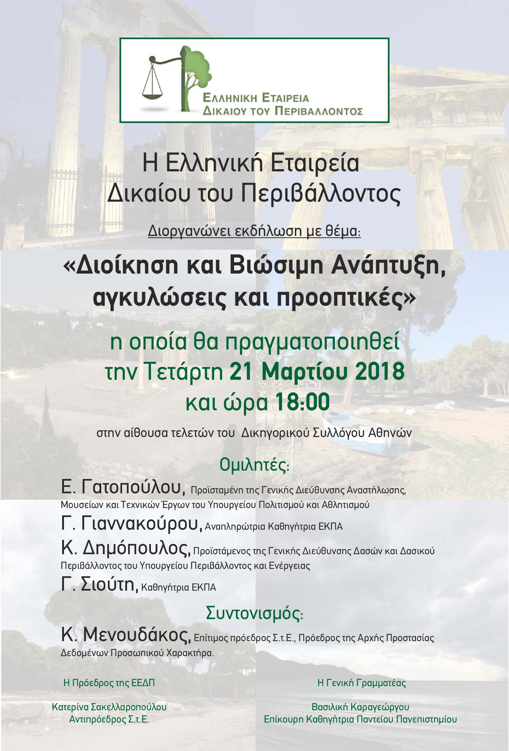 Η Ελληνική Εταιρεία Δικαίου Περιβάλλοντος διοργανώνει εκδήλωση με θέμα: “Διοίκηση και Βιώσιμη Ανάπτυξη, αγκυλώσεις και προοπτικές”. Η εκδήλωση θα πραγματοποιηθεί στις 21.03.2018 και ώρα 18:00 στην αίθουσα τελετών του Δικηγορικού Συλλόγου Αθηνών.